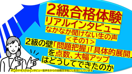2級面接の壁、問題把握、具体的展開を大幅アップして合格した合格体験談インタビューの全文をPDFでご提供可能です。次の申し込みフォームからお申し込みください。